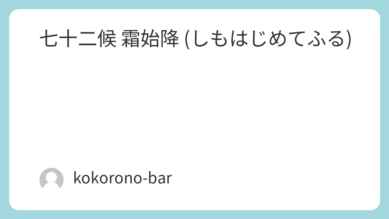 七十二候「霜始降(しもはじめてふる)」は、晩秋に訪れる冷え込みを表す言葉です。大地に白い霜が降り始めるこの時期は、冬の気配を感じる節目でもあります。