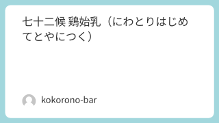 七十二候 第七十二候 鶏始乳(にわとりはじめてとやにつく) | 七十二候 春が深まり、鶏が卵を産み始める頃の七十二候の一つ、鶏始乳(にわとりはじめてとやにつく)。寒さの緩んだ時期に鶏が卵を産み始めることを示しており、例年は3月上旬から中旬にあたります。春の生命力を象徴する季節です。 鶏始乳とはどんな季節? 七十二... 2025.09.28 七十二候四季・暦