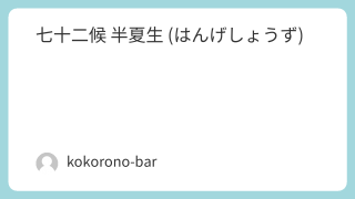 七十二候 第三十候 半夏生 (はんげしょうず) | 七十二候 七十二候「半夏生(はんげしょうず)」は、カラスビシャクという薬草が生え始める頃を表します。梅雨の後半にあたり、農作業の大きな区切りとして古くから重要視されてきました。 半夏生とはどんな季節か 「半夏生」は二十四節気「夏至」の末候にあたり、例... 2025.09.27 七十二候四季・暦