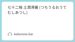七十二候 第三十五候 土潤溽暑(つちうるおいてむしあつし) | 七十二候 七十二候「土潤溽暑(つちうるおうてむしあつし)」は、雨を含んだ大地が湿り、蒸し暑さが増す頃を表します。夏の盛りを象徴する候で、体感としても一年で最も厳しい暑さを迎えます。 土潤溽暑とはどんな季節か 「土潤溽暑」は二十四節気「大暑」の次候にあ... 2025.09.27 七十二候四季・暦