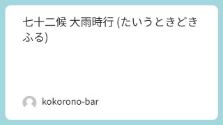 七十二候 第三十六候 大雨時行 (たいうときどきふる) | 七十二候 七十二候「大雨時行(たいうときどきふる)」は、夏の盛りに激しい夕立やにわか雨が降る頃を表します。入道雲から突然降り注ぐ雨は、大地を潤し、夏から秋への移ろいを告げます。 大雨時行とはどんな季節か 「大雨時行」は二十四節気「大暑」の末候にあたり... 2025.09.27 七十二候四季・暦