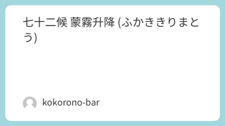 七十二候 第三十九候 蒙霧升降 (ふかききりまとう) | 七十二候 七十二候「蒙霧升降(ふかききりまとう)」は、朝晩に深い霧が立ち込める頃を表します。視界を包み込む霧は、秋の到来と静けさを告げる幻想的な風景を生み出します。 蒙霧升降とはどんな季節か 「蒙霧升降」は二十四節気「処暑」の初候にあたり、8月下旬頃... 2025.09.27 七十二候四季・暦