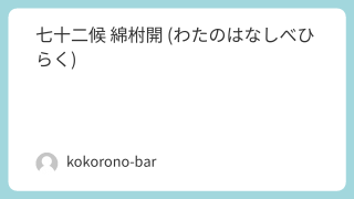 七十二候 第四十候 綿柎開 (わたのはなしべひらく) | 七十二候 七十二候「綿柎開(わたのはなしべひらく)」は、綿の実を包む萼(がく)が開き、白い繊維が顔を出す頃を表します。晩夏から初秋にかけて、自然が秋支度を始める合図のひとつです。 綿柎開とはどんな季節か 「綿柎開」は二十四節気「処暑」の次候にあたり、... 2025.09.27 七十二候四季・暦