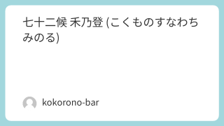 七十二候 第四十二候 禾乃登 (こくものすなわちみのる) | 七十二候 七十二候「禾乃登(こくものすなわちみのる)」は、稲をはじめとする穀物がたわわに実る頃を表します。黄金色に染まる田園風景が広がり、秋の収穫の喜びに満ちる季節です。 禾乃登とはどんな季節か 「禾乃登」は二十四節気「白露」の次候にあたり、9月中旬... 2025.09.27 七十二候四季・暦