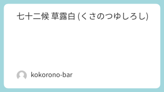 七十二候 第四十三候 草露白 (くさのつゆしろし) | 七十二候 七十二候「草露白(くさのつゆしろし)」は、早朝の草葉に宿る露が白く輝き始める頃を表します。涼やかな朝の気配とともに、秋の訪れを五感で感じられる時期です。 草露白とはどんな季節か 「草露白」は二十四節気「白露」の初候にあたり、9月上旬頃に訪れ... 2025.09.27 七十二候四季・暦