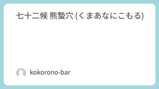 七十二候 第六十二候 熊蟄穴 (くまあなにこもる) | 七十二候 冬の間、熊が穴や巣にこもる七十二候の一つ、熊蟄穴(くまあなにこもる)。寒さを避けて冬眠する熊の姿は、自然界の季節のリズムを象徴します。例年は11月下旬から12月上旬にあたります。 熊蟄穴とはどんな季節? 七十二候は一年を72に分け、自然や生... 2025.09.26 七十二候四季・暦
