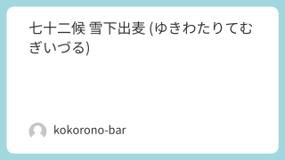 七十二候 第六十六候 雪下出麦 (ゆきわたりてむぎいづる) | 七十二候 雪の下で麦が芽を出す七十二候の一つ、雪下出麦(ゆきわたりてむぎいづる)。厳しい冬の雪の下でも春の準備を始める麦の姿は、自然の生命力を象徴します。例年は2月下旬から3月中旬にあたります。 雪下出麦とはどんな季節? 七十二候は一年を72に分け、... 2025.09.27 七十二候四季・暦