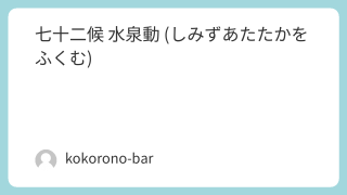 七十二候 第六十八候 水泉動 (しみずあたたかをふくむ) | 七十二候 春の訪れを告げる兆しとして、地下の泉や湧き水が動き始める七十二候の一つ、水泉動(しみずあたたかをふくむ)。冬の間に凍っていた水が温み、地下水の流れが活発になる時期を示します。例年は2月下旬から3月上旬です。 水泉動とはどんな季節? 七十二候... 2025.09.25 七十二候四季・暦